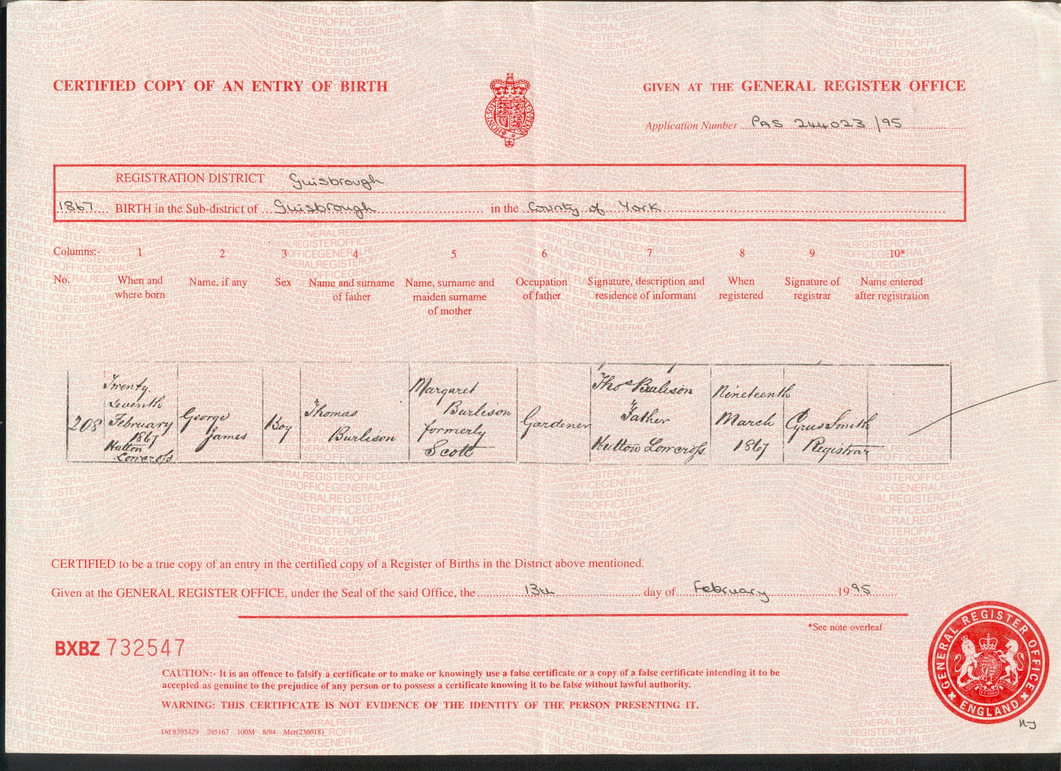 George James Burlison birth cert