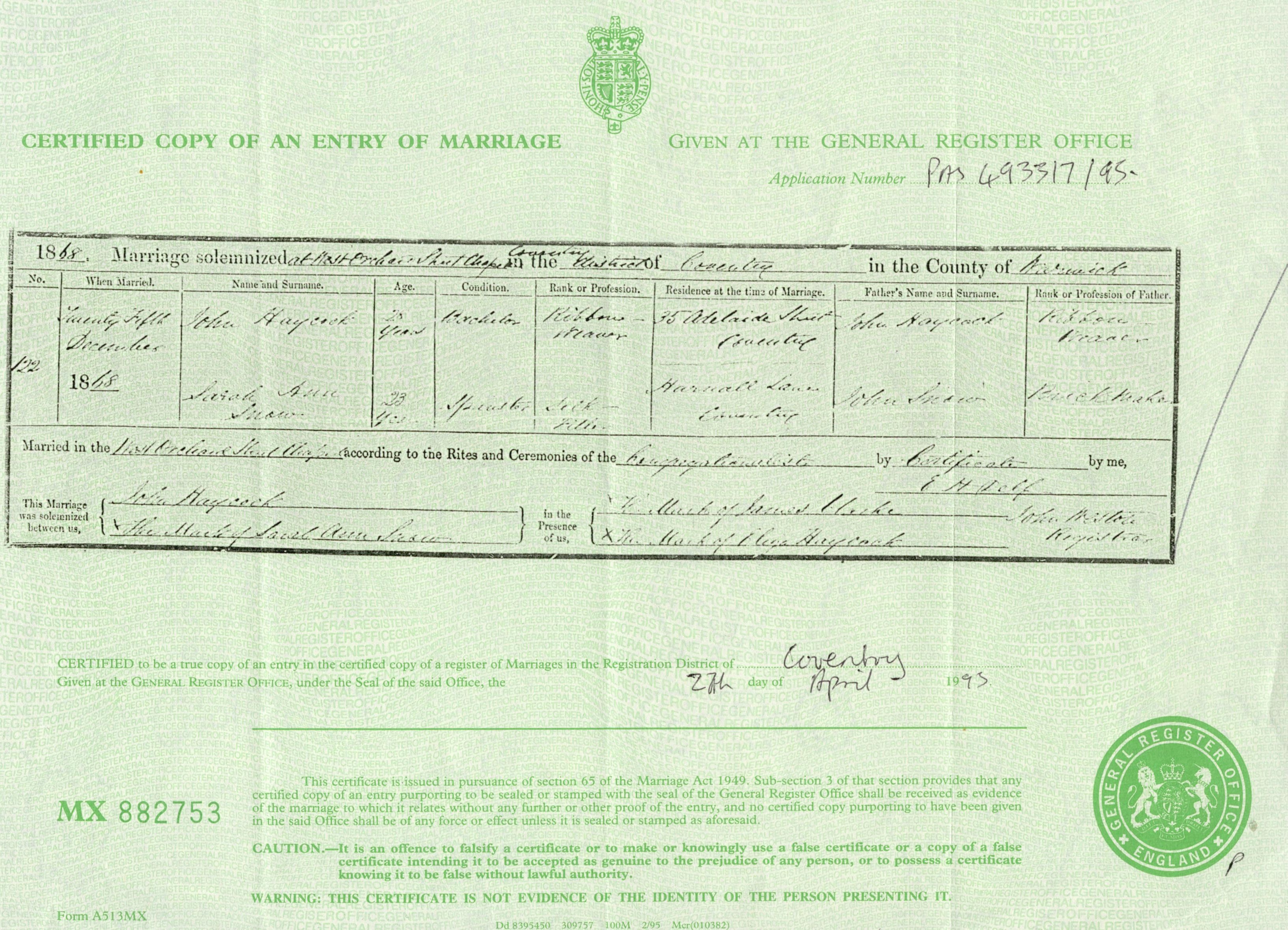 John Haycock / Sarah Ann Snow wedding cert