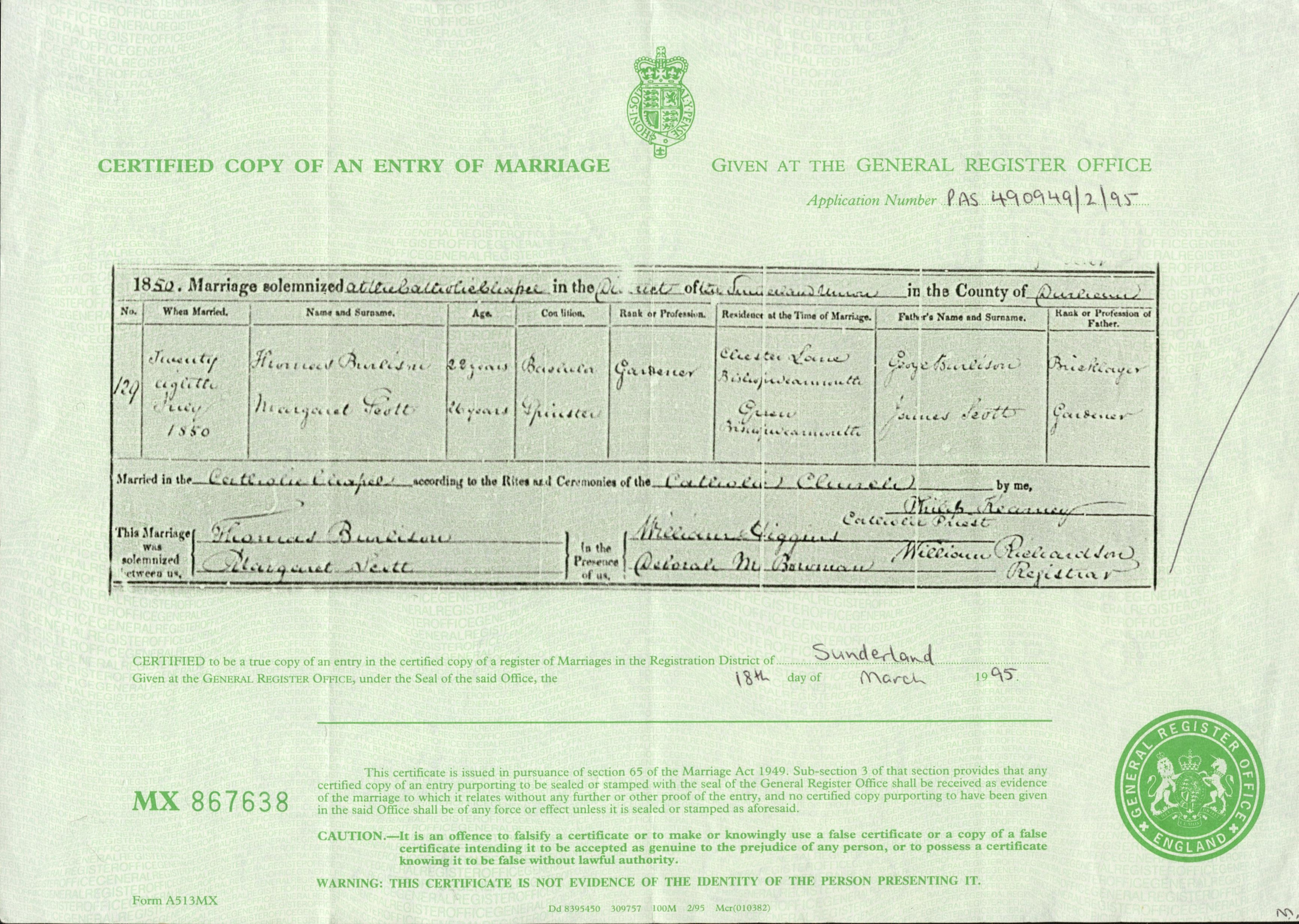 Thomas Burlison / Margaret Scott wedding cert
